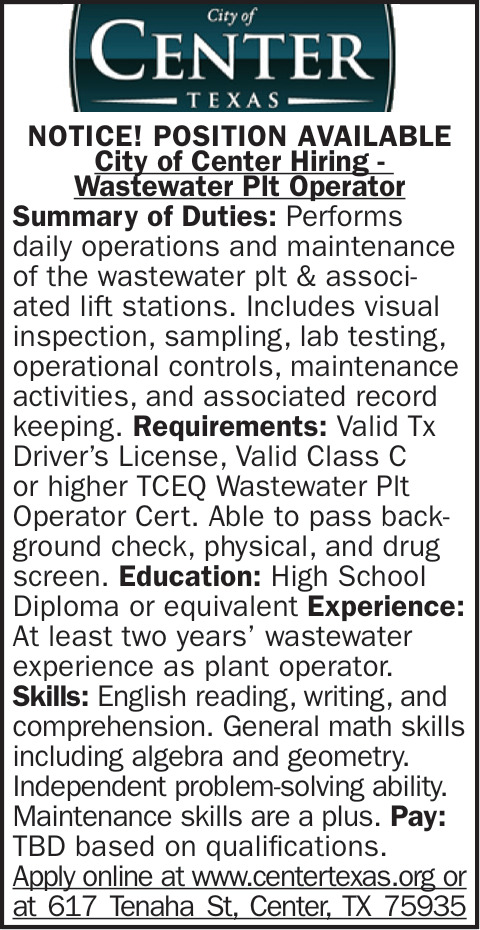 Mar 03, 2026. City of Center Jobs from Longview News-Journal